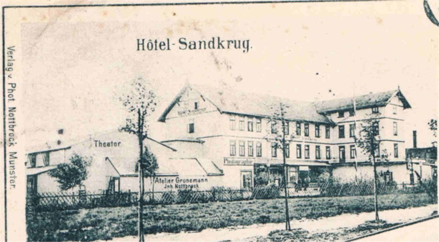 1900-08-18 Eine Postkarte des Verlag Phot. Nottbrock Munster zeigt mehrere Gebäude und Bilder. Auffällig ist das Bild vom Hotel Sandkrug, in dem lt. Bild auch der genannte Verlag untergebracht war. Zudem zeigt das Bild den Anbau eines Theaters sowie des Ateliers Gronemann Inh. Nottbrock. Die Postkarte zeigt auch die Niederlage der Cigarrenfabrik Wilhelm Meyer & Co Bremen sowie der Conditorei Sander Hildesheim.